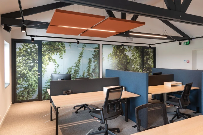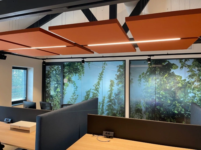 Les panneaux acoustiques suspendus structurent le plafond tout en absorbant efficacement les réflexions sonores générées par les volumes ouverts et les surfaces rigides. Leur intégration participe à l’identité visuelle du projet, en dialogue avec les éléments en bois et les aménagements sur mesure. Le résultat est un environnement professionnel équilibré, où design, discrétion et confort acoustique coexistent harmonieusement.