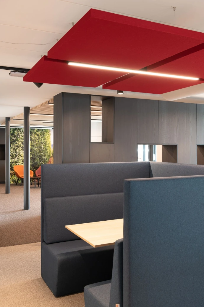 Les solutions acoustiques ont été intégrées de manière stratégique afin de réduire la réverbération et d’améliorer l’absorption sonore globale. Les éléments suspendus apportent une dimension architecturale forte tout en optimisant l’intelligibilité et la discrétion des échanges.